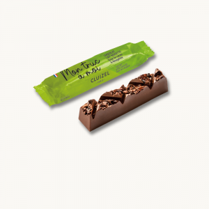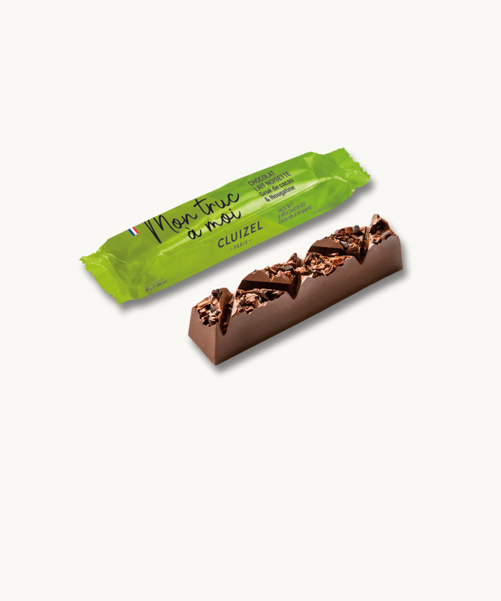 La barre Mon Truc à Moi pour un moment intime, un réel moment de plaisir équilibré entre la douceur d’un chocolat au lait 45% de cacao mélangé à la pâte de noisette, agrémenté de de grué de cacao et de nougatine pour un croquant extrême.