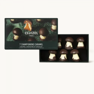 En tout premier lieu un coffret champignons ! Ensuite pour le pied c’est un caramel tendre au beurre enrobé de chocolat ivoire. Et le chapeau en nougatine pure grains d’amandes une saveur authentique avec une texture incroyable. Bien sûr que ce coffret champignons sera un cadeau original et ludique ! Finalement qu’elle que soit la saison nous mangeons bien des champignons, alors maintenant même pour le dessert.