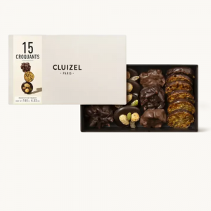 Sucre, amande, cacaos, beurre de cacao, lait entier en poudre, cube melon (melon, sucre, sirop glucose, colorant : anthocyanes, extrait paprika, chlorophylline cuivrique), crème, noisette, sirop de glucose, miel, écorce d’orange confite (orange, sucre, sirop de glucose), pistache, émulsifiant (lécithine de colza), vanille Bourbon en gousse.