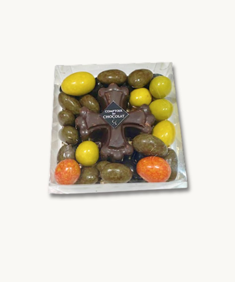 Coffret garni d’une Croix du Languedoc en Chocolat Noir 72% avec Praliné “CLUIZEL”, Olives des Garrigues et Amandes Enrobées de chocolat noir et lait