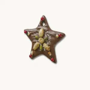 Chaque pointe de l’étoile est enrichie de fruits secs et d’agrumes soigneusement sélectionnés : amandes et noisettes caramélisées pour un croquant irrésistible, pistaches pour une note végétale délicate, et dés d’orange confite pour une touche fruitée qui réveille les papilles. Les petites billes rouges viennent parfaire l’ensemble, apportant un charme festif et éclatant.