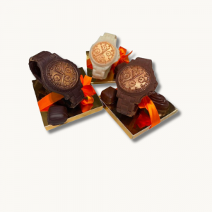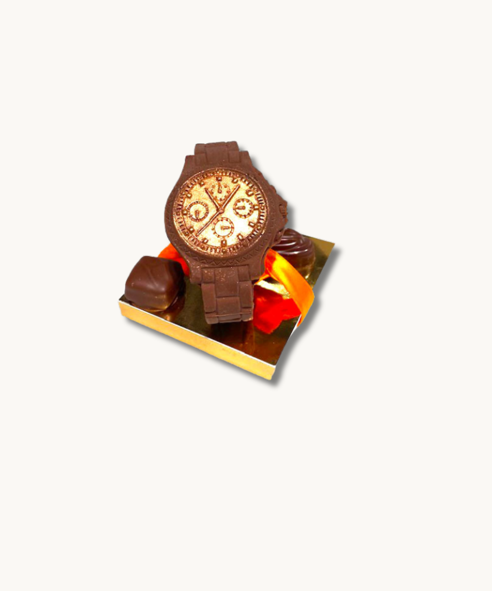 Montre en chocolat noir, lait ou blanc, accompagnée de 2 délicieux chocolats