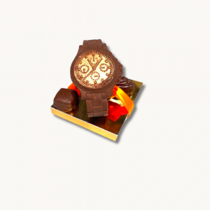 Ensuite une montre en chocolat noir, lait ou blanc, accompagnée de 2 délicieux chocolats pour le surprendre