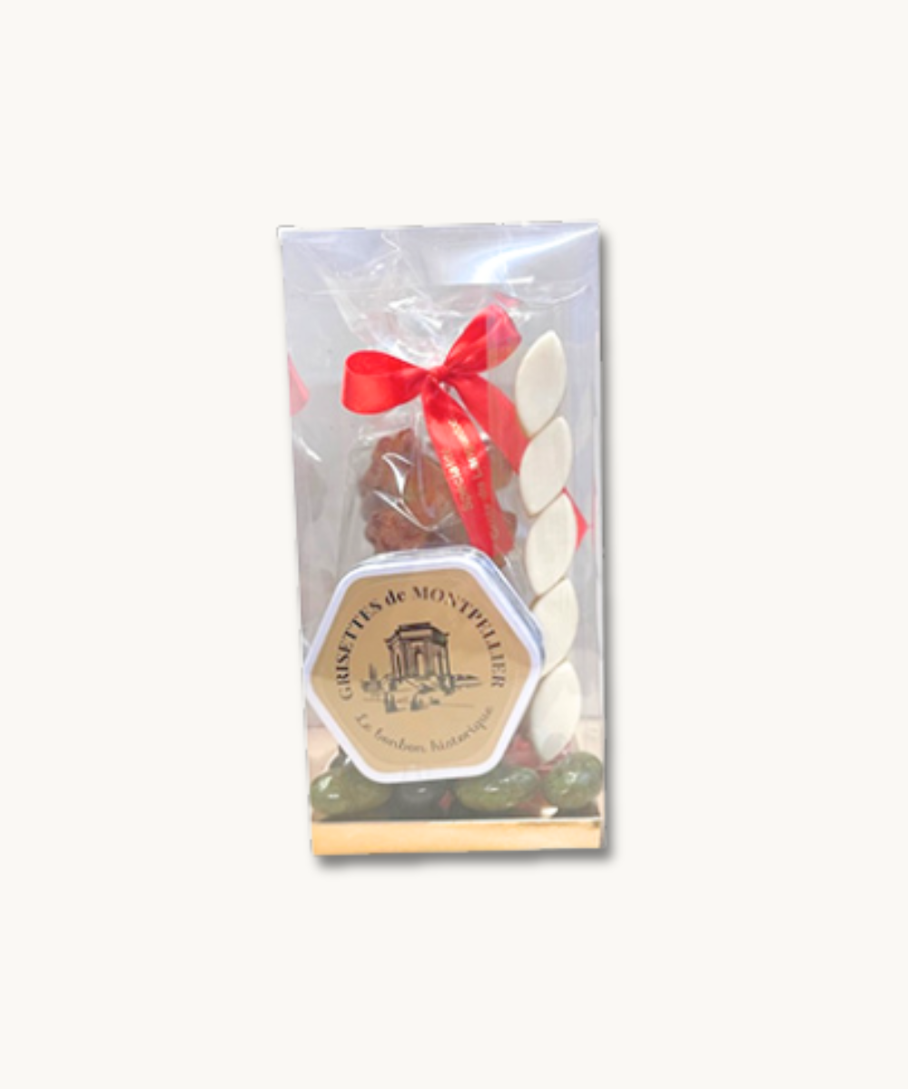 Spécialités régionales : grisettes de Montpellier “bonbon miel et réglisse” Calissons “pâte d’amande” et olives de l’Hérault, amandes enrobées de chocolat noir et lait
